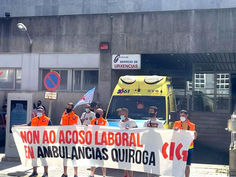 Traballadores e traballadoras do sector de ambulancias concentráronse este venres diante do Centro de Saúde de Lalín para apoiar os seus compañeiros e compañeiras da base do 061 nesta vila e para denunciar as presións constantes e os incumprimentos desde que Ambulancias Quiroga se fixo cargo da concesión no lote da área sanitaria de Santiago. A mobilización, convocada pola CIG, é a primeira que se produce tras varios intentos de reunirse co empresario para buscar unha solución, ao que este se ten negado.