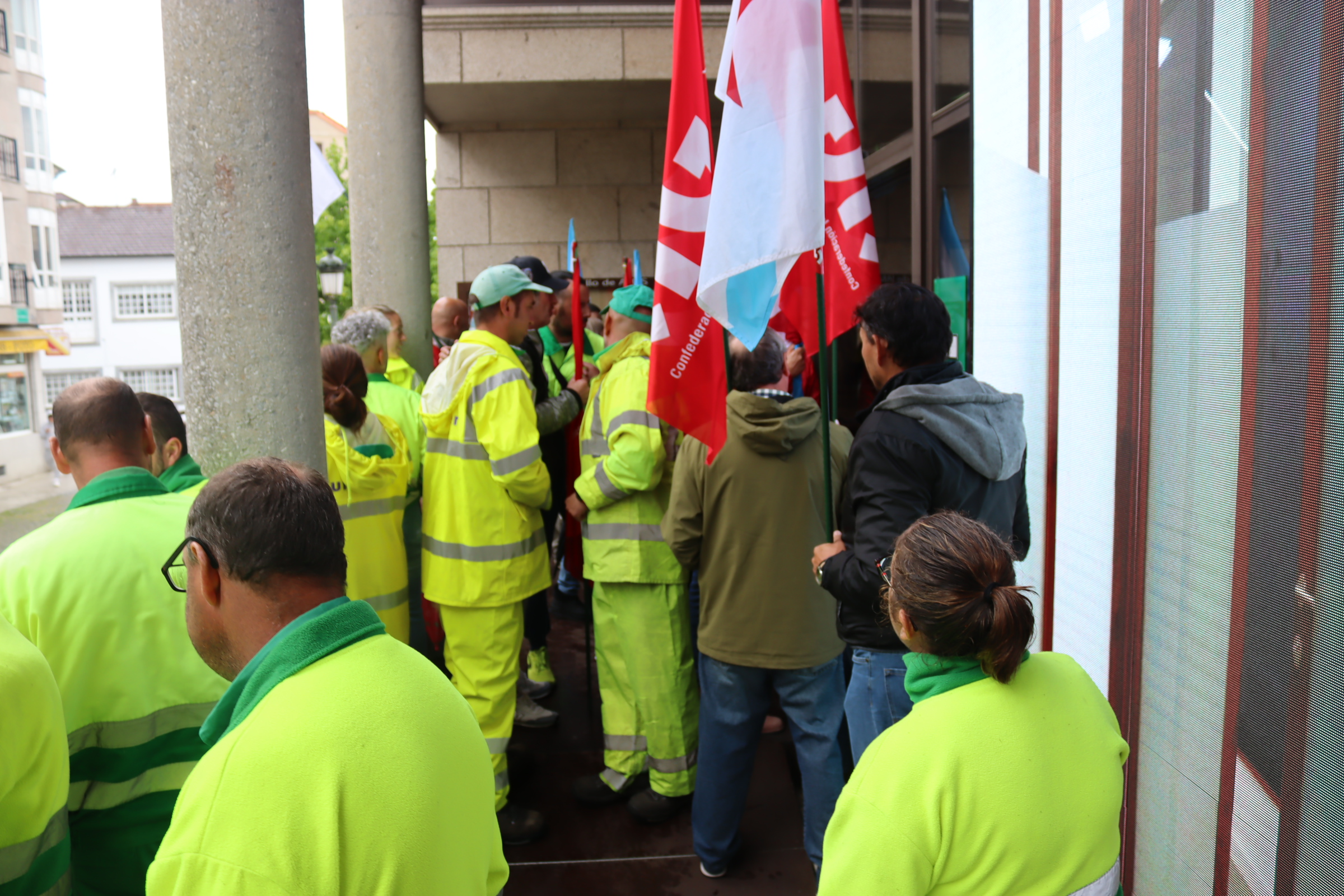 Traballadoras e traballadores do servizo de limpeza viaria e punto limpo de Ames, concesionado a Urbaser, concentráronse esta mañá diante da casa do concello para denunciar a “mísera” proposta económica presentada pola empresa. Canda eles sumáronse á mobilización, en apoio das súas reivindicacións, membros do comité de empresa de Urbaser de Santiago e traballadoras do SAF de Ames, que tamén protagonizaron recentemente mobilizacións en demanda de melloras nas súas condicións laborais e salariais.