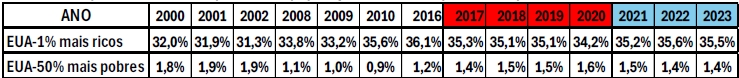 Quadro 1- A repartição da riqueza nacional líquida nos Estados Unidos pelos 1% da população constituída pelos mais ricos e por 50% da população constituída pelos mais pobres – 2000 a 2023
