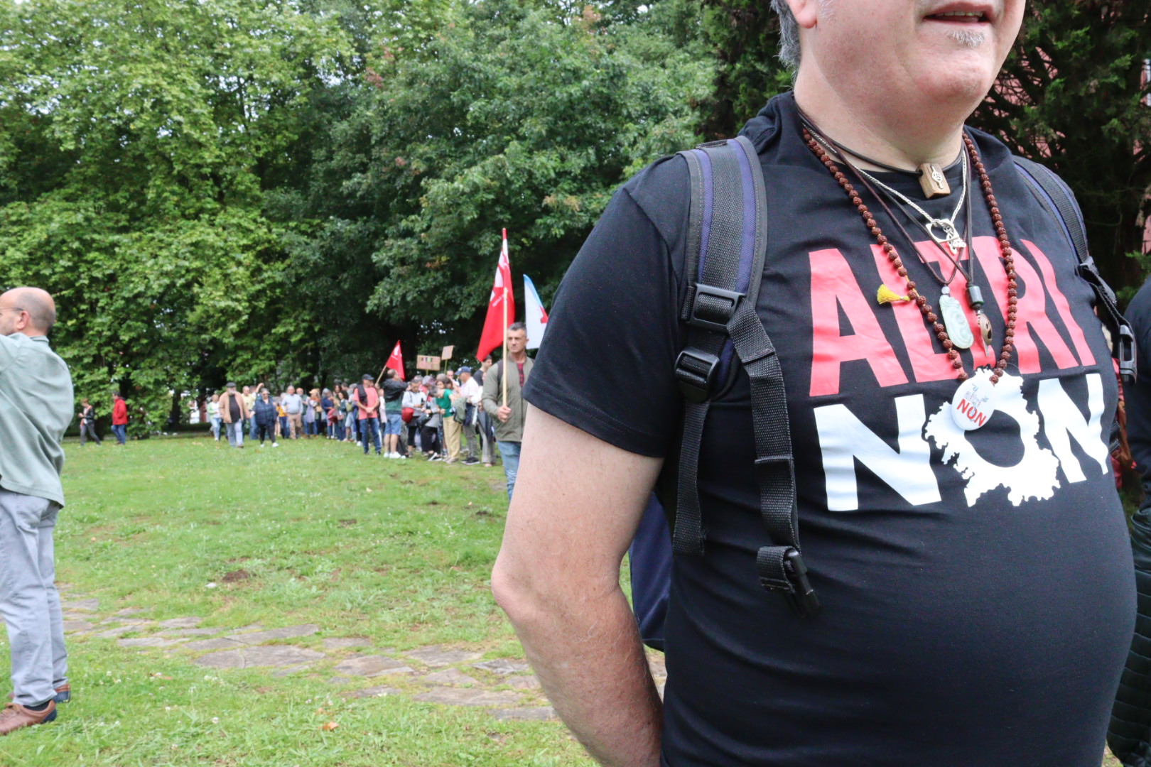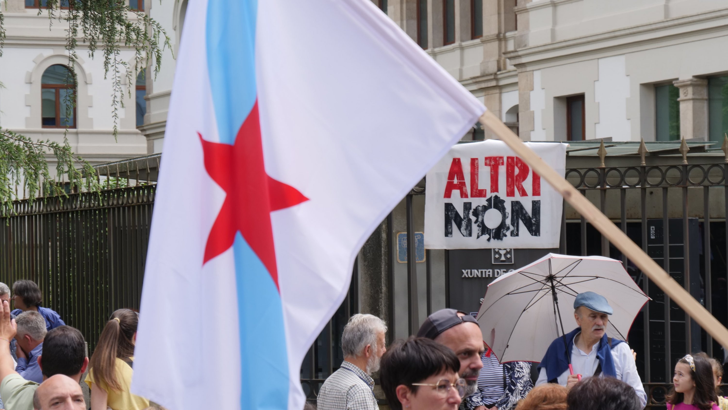 Este domingo somos milleiros aquí, en Santiago de Compostela, a rodear a Xunta de Galiza. É o Goberno galego o que debe cesar no seu apoio á macrocelulosa. É o Goberno de Madrid o que debe negar a este proxecto as axudas europeas. Os gobernos existen para facilitar a vida das persoas, non para atacarnos. Os gobernos existen para apostar por esta terra e polo seu futuro. Queremos seguir vivindo e traballando na nosa terra e por iso berramos ben alto e ben claro con todo o noso corazón: Altri non!