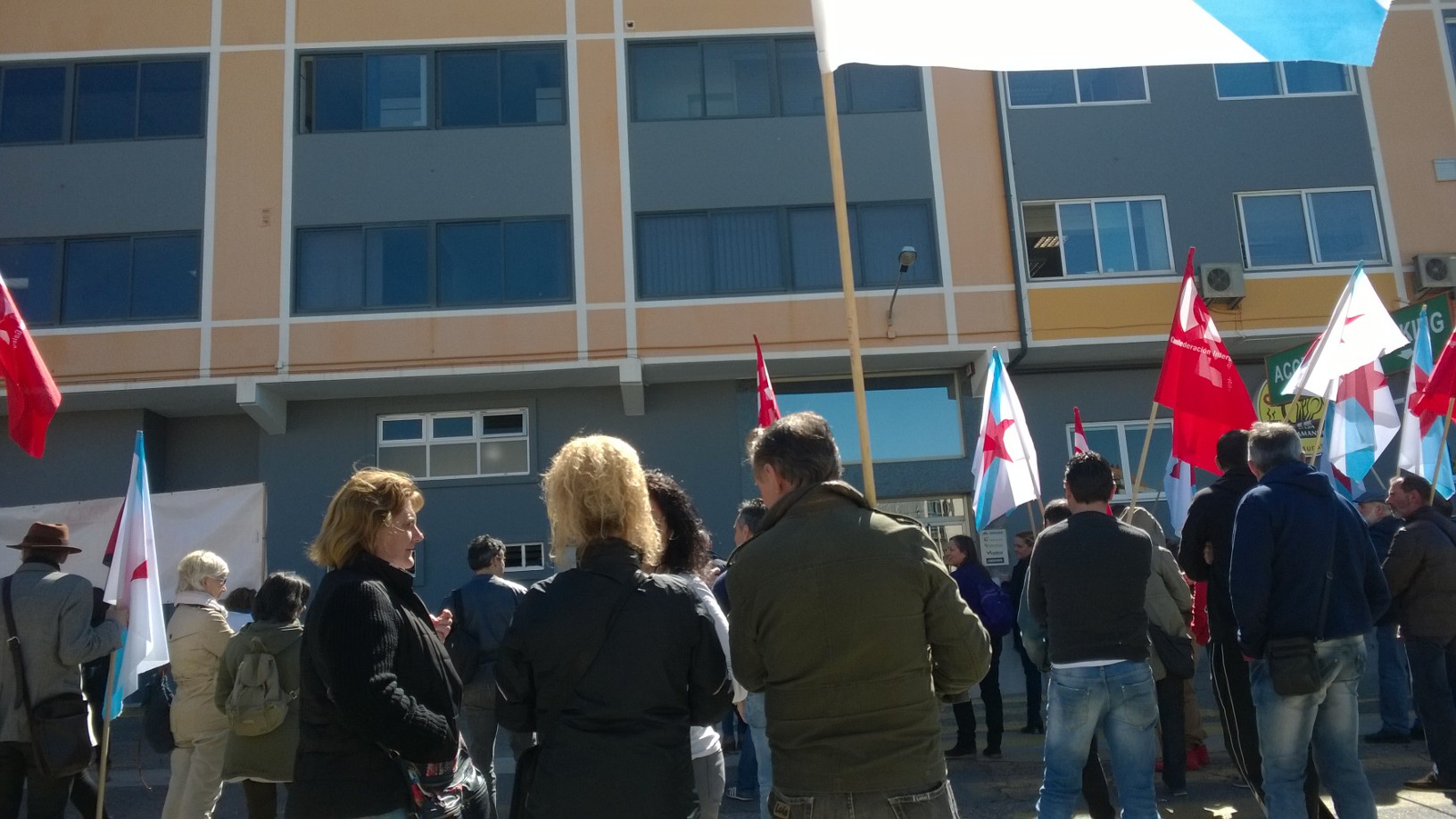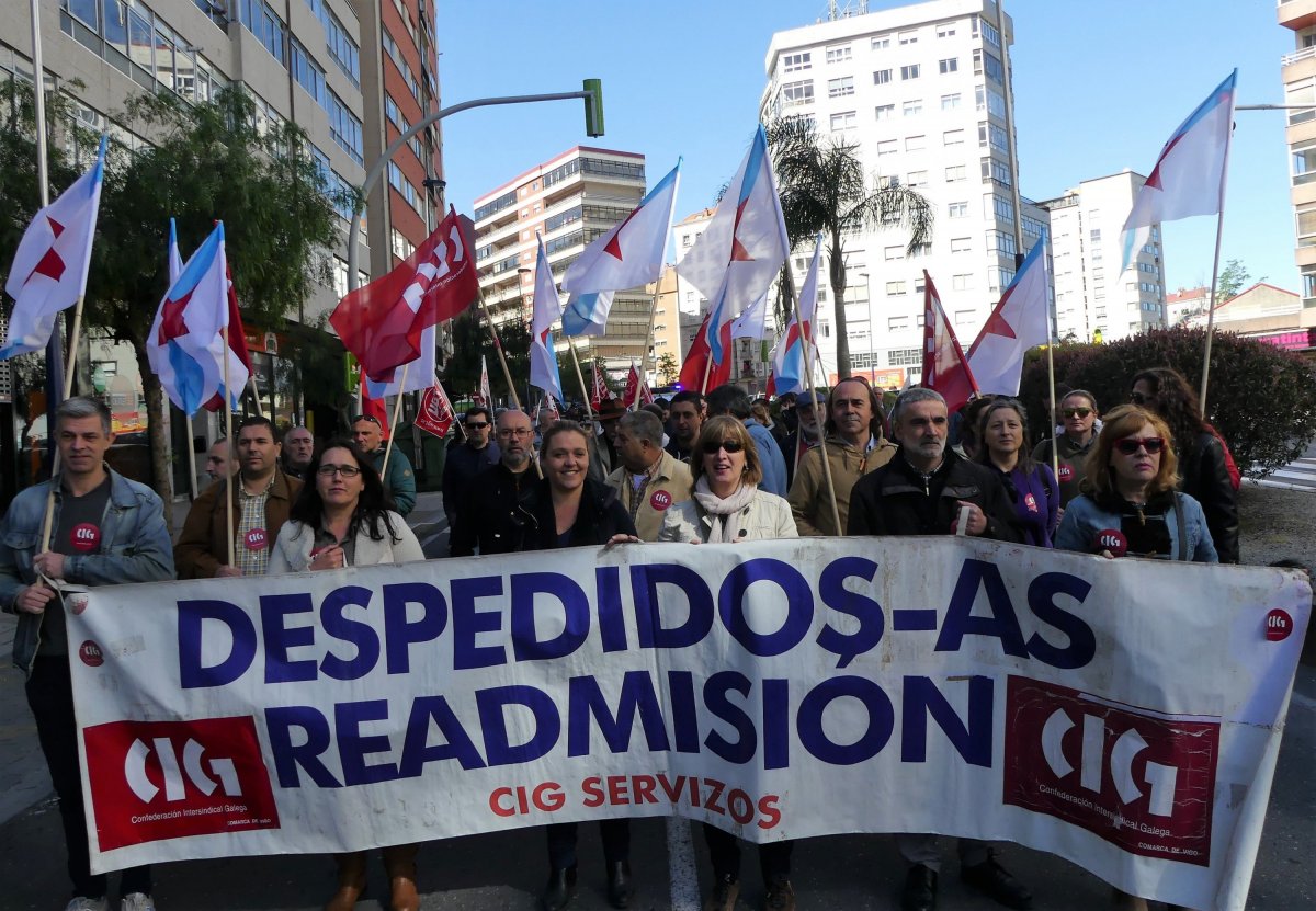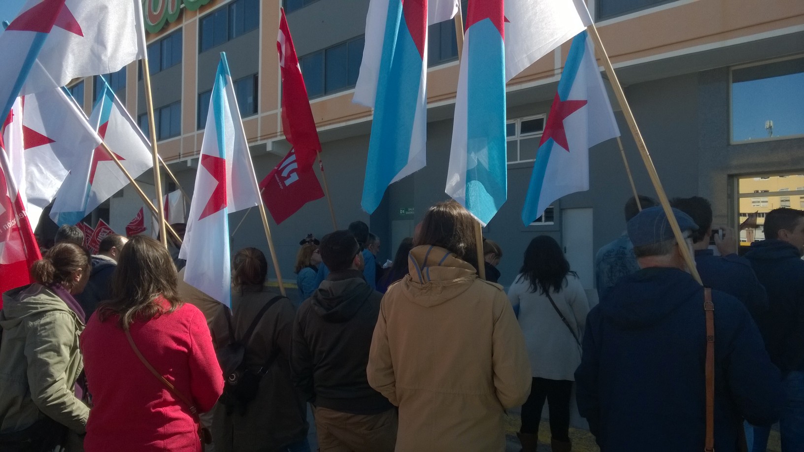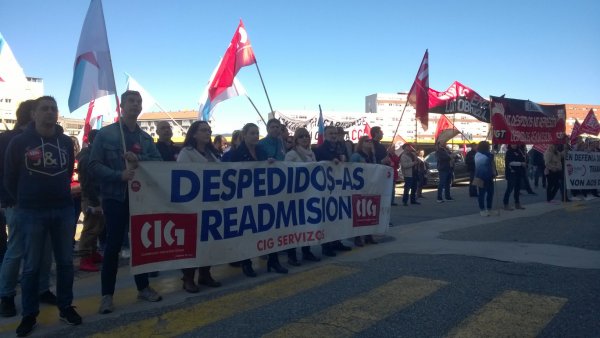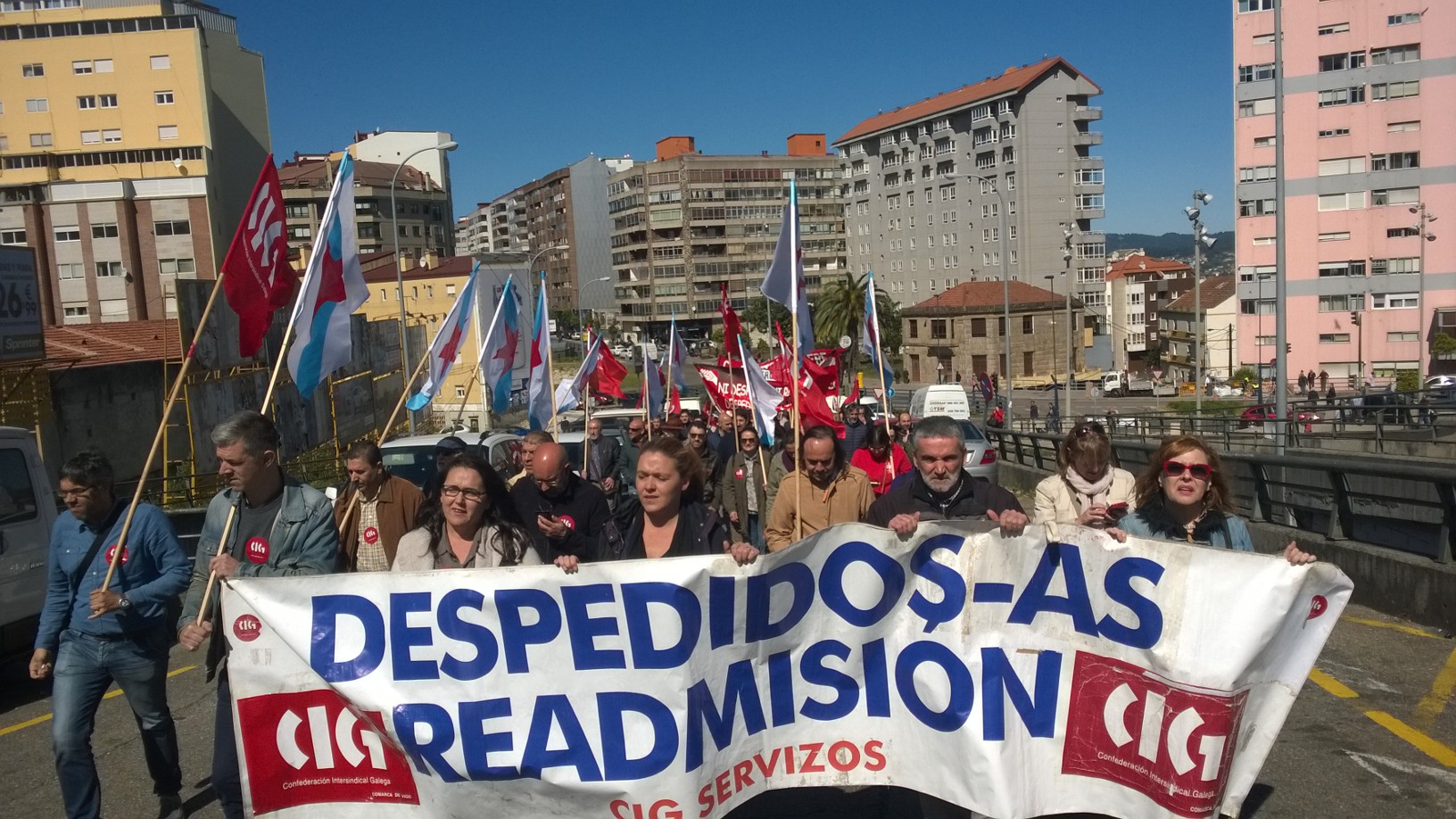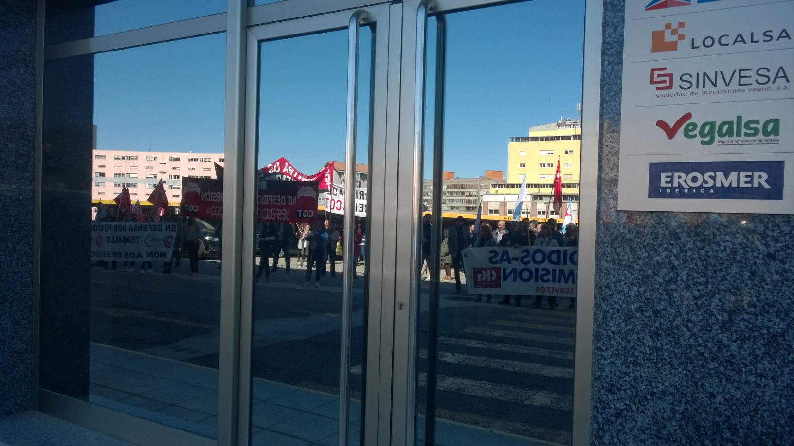 Tanto durante o percorrido como unha vez diante das oficinas berráronse consignas contra a represión laboral e os despedimentos e reclamouse a readimisión dos oito traballadores/as afectados/as. Con esta protesta os sindicatos danlle continuidade ao calendario de mobilizacións iniciado tempo atrás.