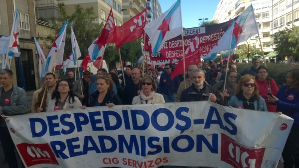 As centrais CIG, CGT e UGT mobilizáronse hoxe polas rúas de Vigo para rexeitar a vaga de despedimentos que o grupo Eroski está a levar a cabo en distintos establecementos da cidade. Nesta ocasión, tras as concentracións celebradas con anterioridade, a protesta consistiu nunha manifestación dende un dos supermercados da marca na Travesía de Vigo até a zona do Troncal, onde se atopan as oficinas centrais da compañía.
