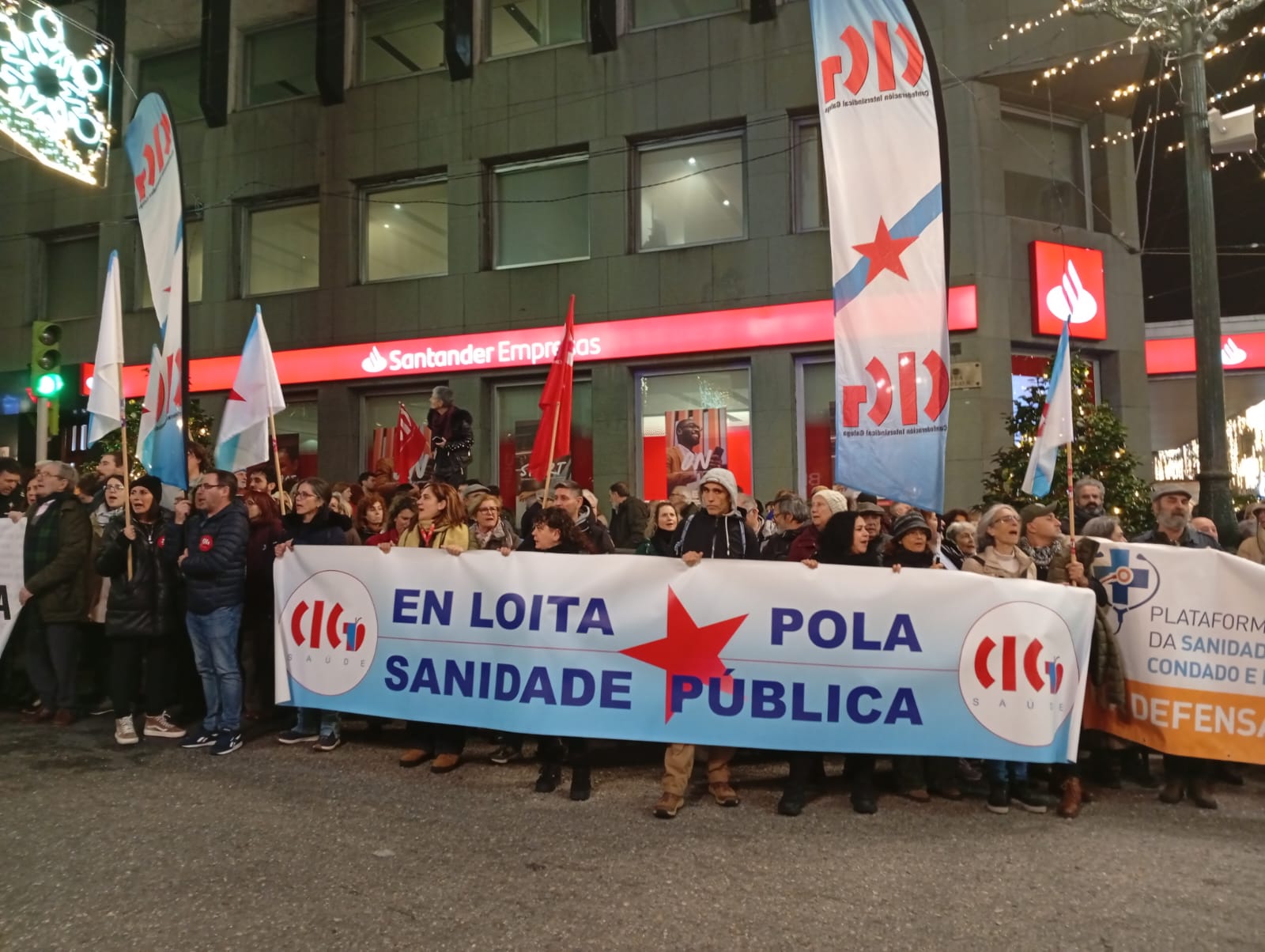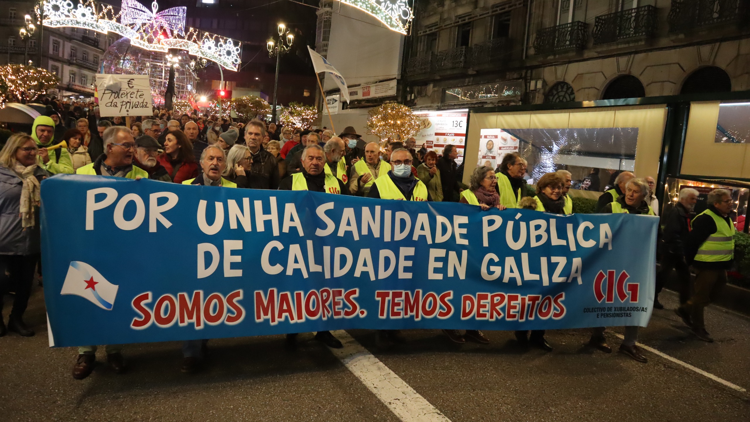 A marcha percorreu a distancia entre a Praza dos Cabalos, de onde saíu pasadas as 19:00 horas, e o cruzamento de Colón, onde se deu lectura a un manifesto no que se esixen “responsabilidades políticas” polas condicións nas que se atopa a área sanitaria e se chama a “defender” as medidas necesarias para dotala dos recursos humanos e materiais necesarios para conseguir unha asistencia sanitaria 100% pública e de calidade. “O que estamos a vivir na actualidade son as consecuencias das condicións nas que se fixo a licitación, a construción e a xestión do Hospital Álvaro Cunqueiro”, sinálase. Un proceso que foi contestado masivamente na rúa e tamén diante do Tribunal Superior de Xustiza de Galiza, na Comisión Europea, no Defensor do Pobo europeo e no Parlamento europeo, “denunciando a vulneración da legalidade española e comunitaria na licitación”.