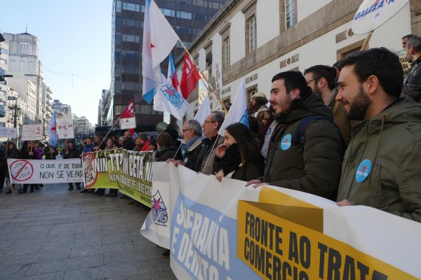 Arredor de 200 persoas participaron hoxe en Vigo na concentración convocada pola plataforma 'Non ao TTIP Galiza' -que agrupa máis de medio cento de organizacións sindicais, políticas e sociais- para rexeitar os tratados de libre comercio, aínda que nesta ocasión a protesta centrouse no CETA que van aprobar nos vindeiros días a Unión Europea e o Canadá.