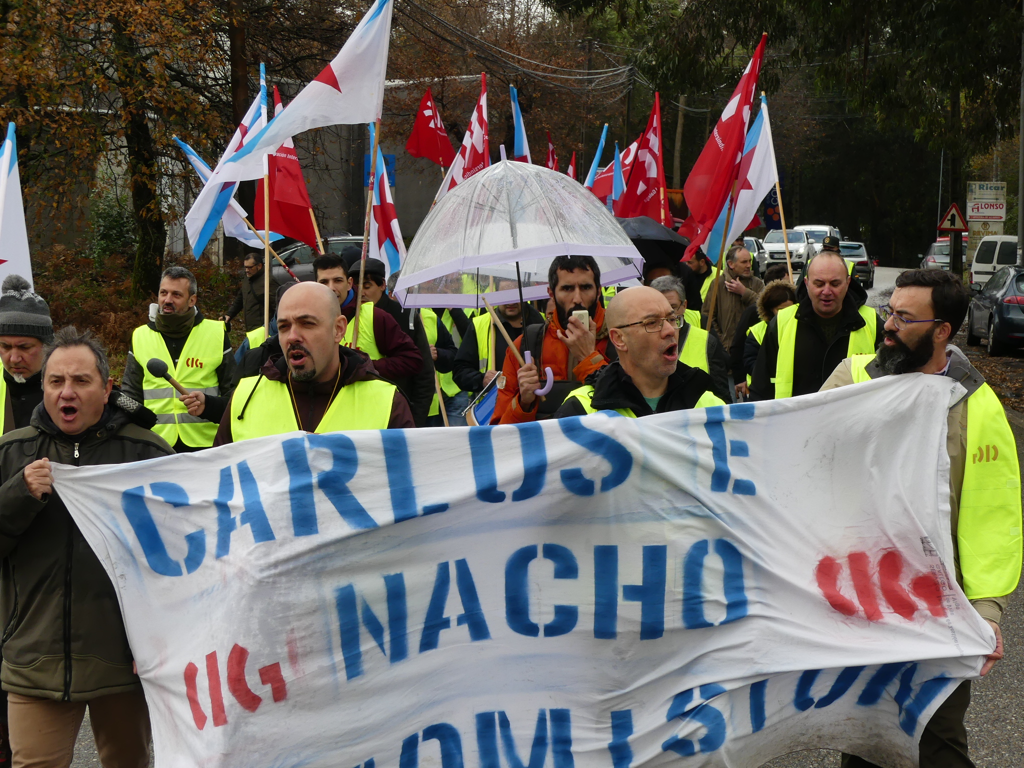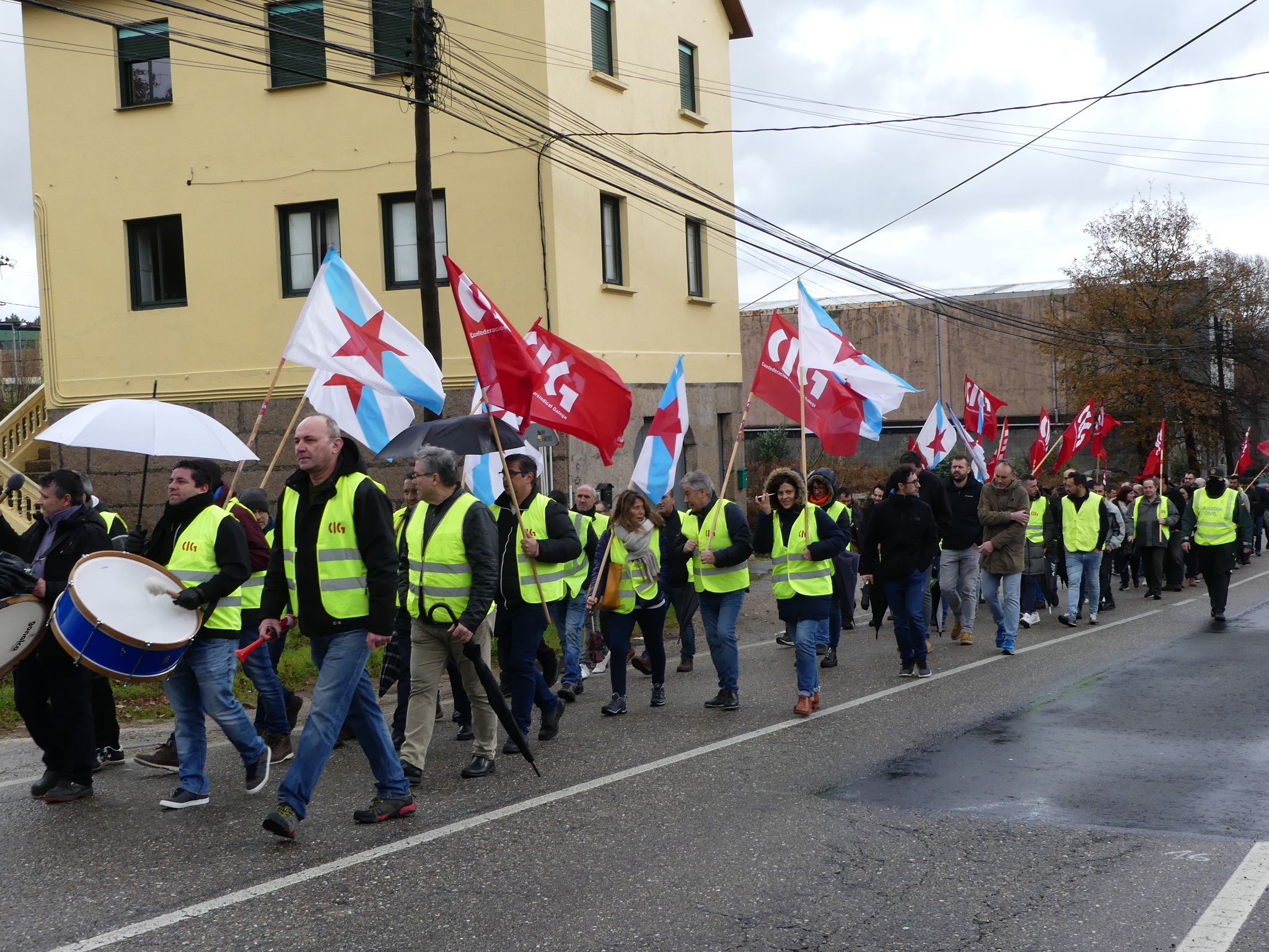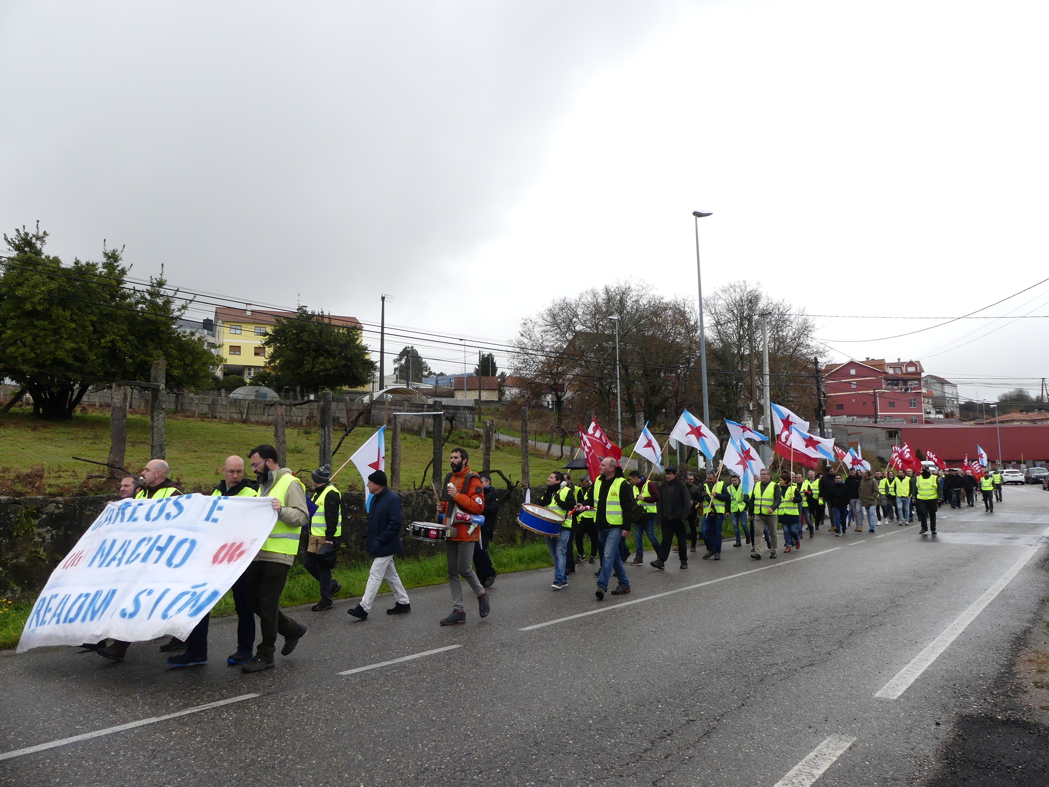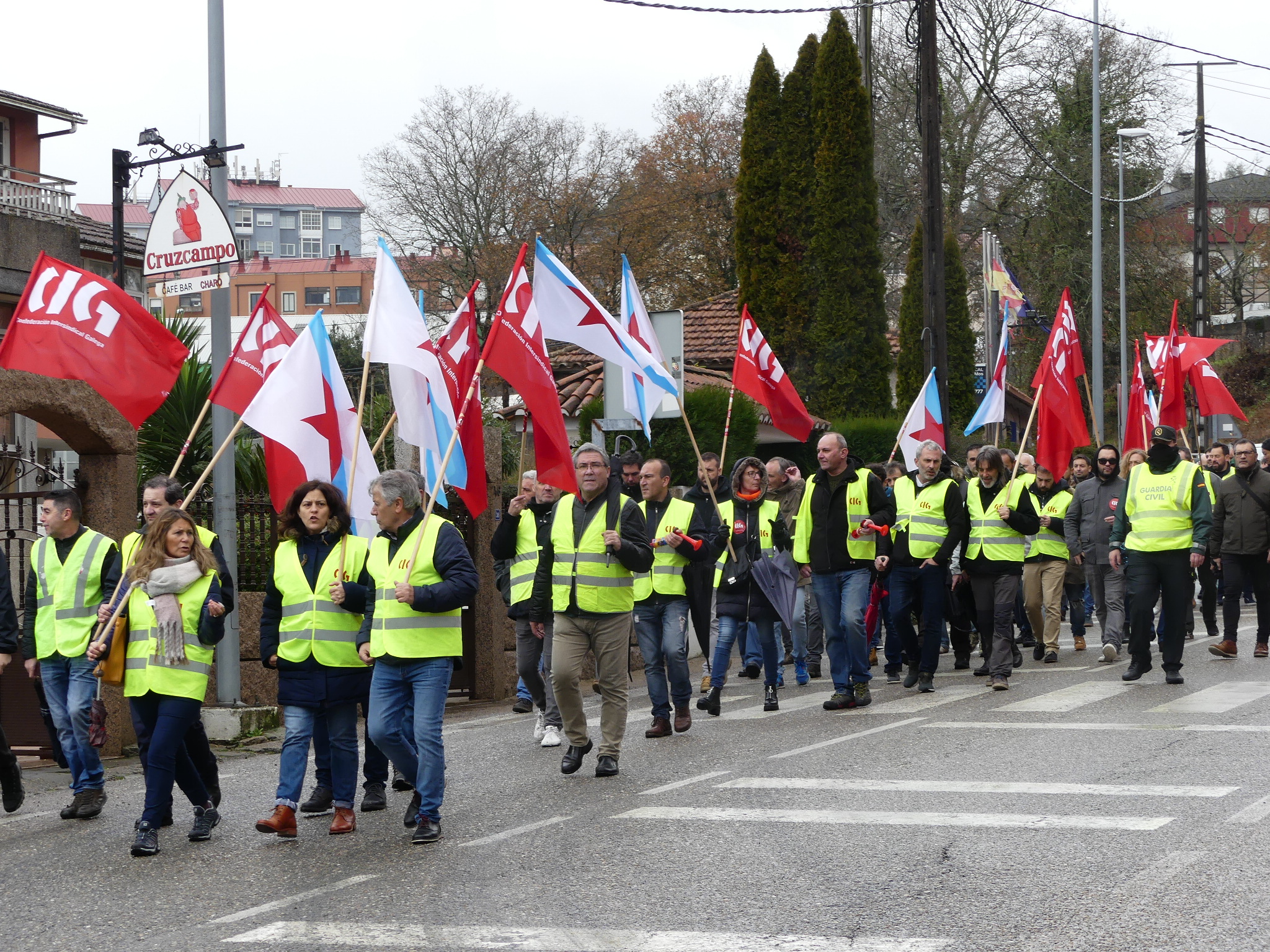 A continuación saíron en manifestación cara ao centro de Mos, continuando cunha ruidosa protesta polas rúas da localidade. Á cabeza da marcha, o secretario comarcal da CIG de Vigo, Alberto Gonçalves, e da federación de Industria, Xulio Fernández, que acompañaban os dous traballadores afectados. Todo o cadro de persoal, que participou na protesta, secundou os paros de catro horas tanto na quenda de noite como na de mañá, e agárdase que na de tarde o seguimento sexa tamén total.