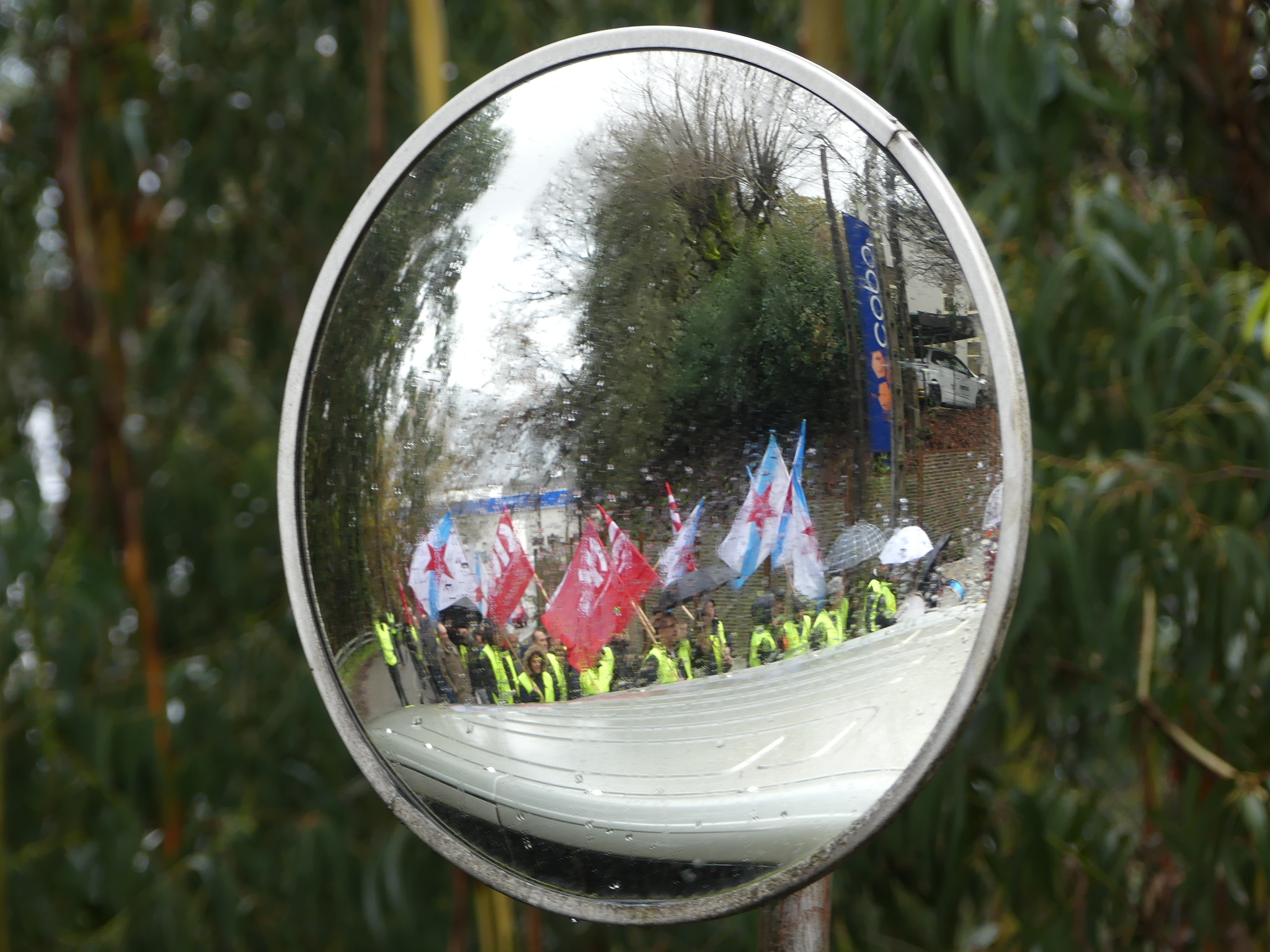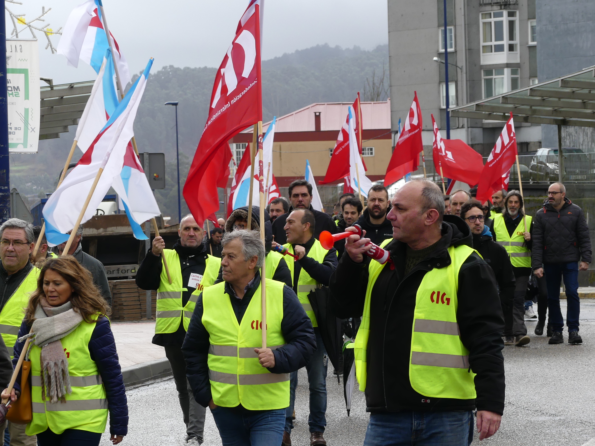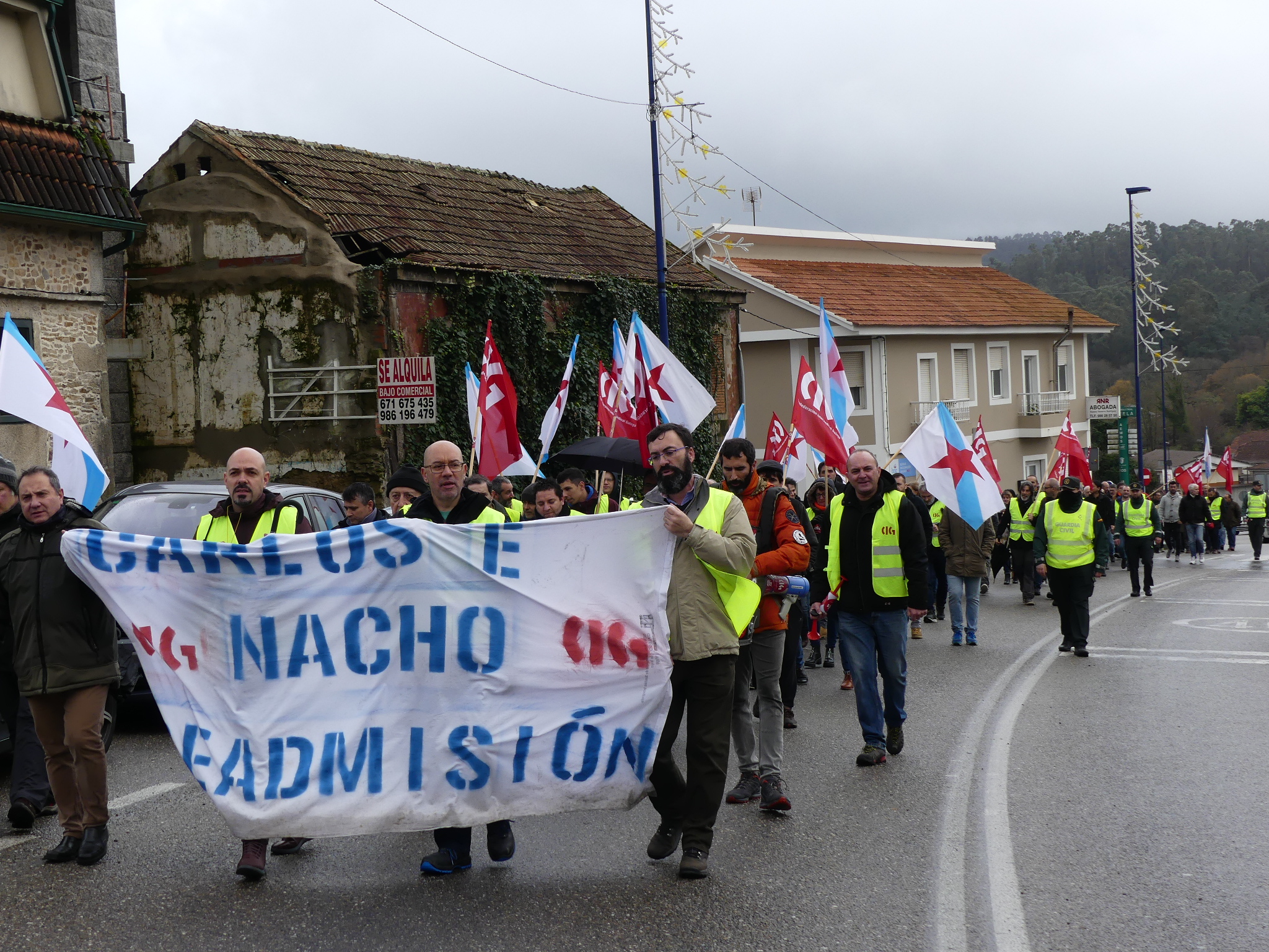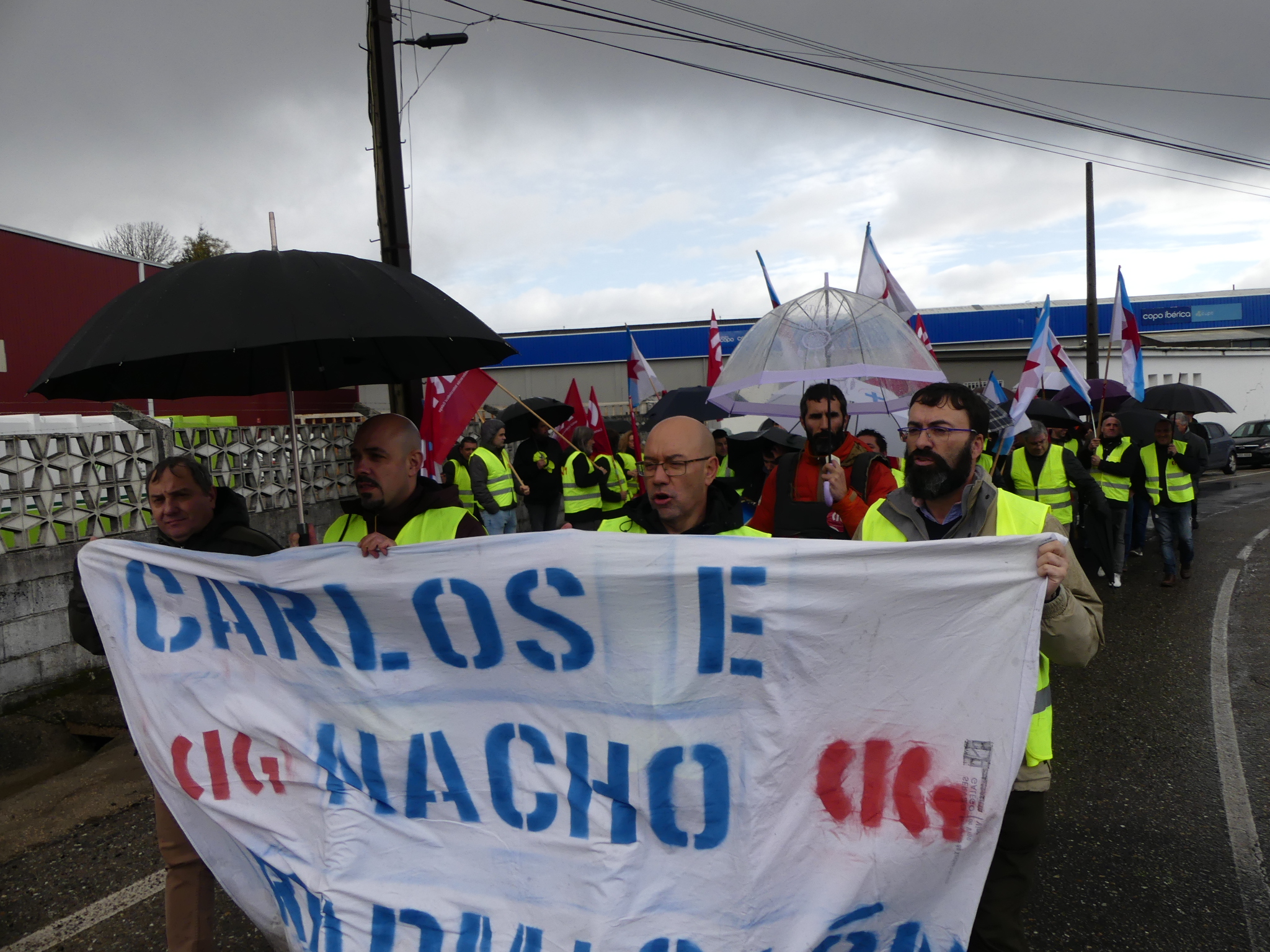 A continuación saíron en manifestación cara ao centro de Mos, continuando cunha ruidosa protesta polas rúas da localidade. Á cabeza da marcha, o secretario comarcal da CIG de Vigo, Alberto Gonçalves, e da federación de Industria, Xulio Fernández, que acompañaban os dous traballadores afectados. Todo o cadro de persoal, que participou na protesta, secundou os paros de catro horas tanto na quenda de noite como na de mañá, e agárdase que na de tarde o seguimento sexa tamén total.