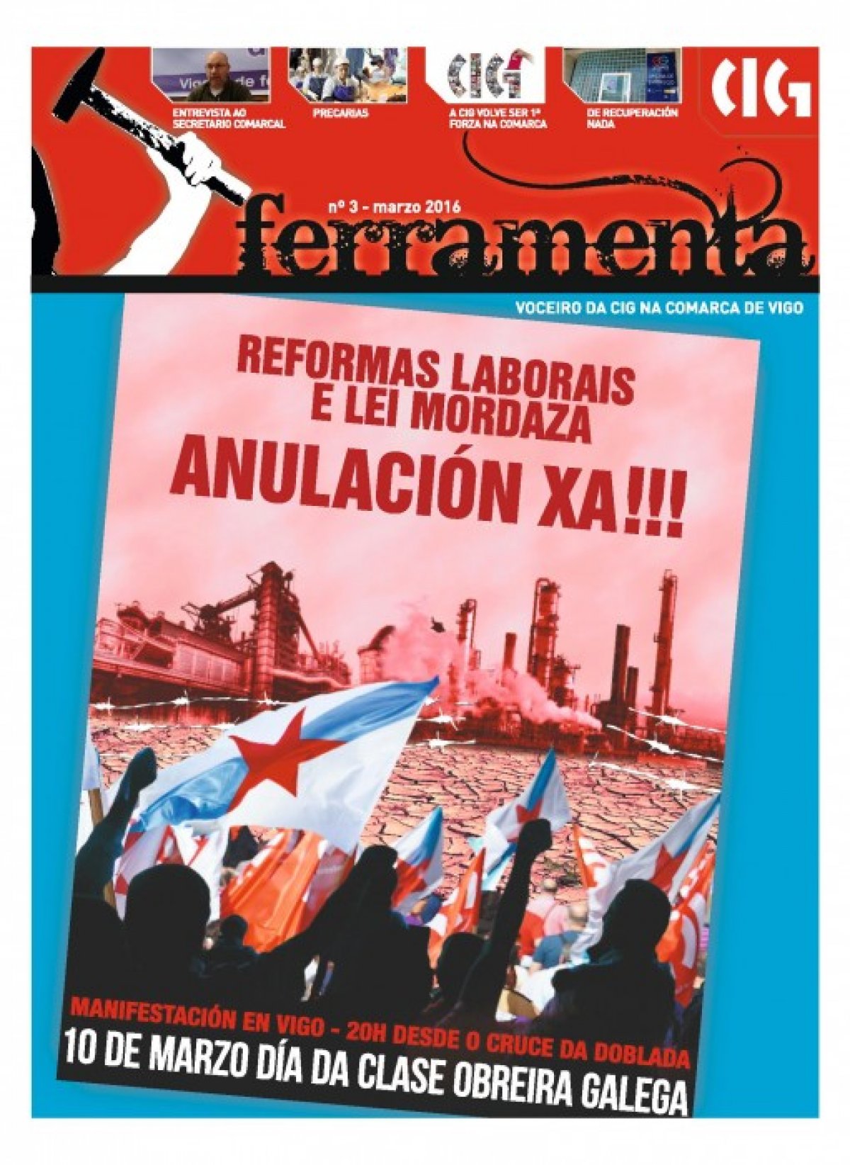 O terceiro número de 'Ferramenta' ten como tema principal a campaña deseñada pola CIG para conmemorar o 10 de Marzo, Día da Clase Obreira Galega, e que ten como eixo fundamental a reclamación de que as reformas laborais e a 'lei mordaza' sexan anuladas.