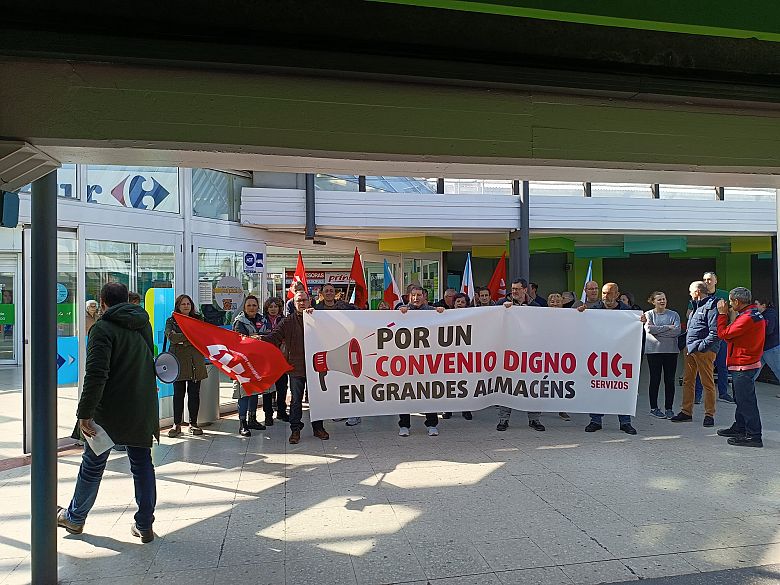 Persoal galego dos grandes almacéns mobilizouse hoxe na Coruña, Lugo e Vilagarcía convocado pola CIG coincidindo coa negociación do convenio estatal do sector en Madrid para reclamar un acordo digno e reivindicar a necesidade de contar cun convenio galego. Segundo denuncian dende a federación de Servizos, a patronal continúa a ofrecer unha suba salarial insuficiente e mantén a súa negativa a eliminar o traballo en domingos e festivos.