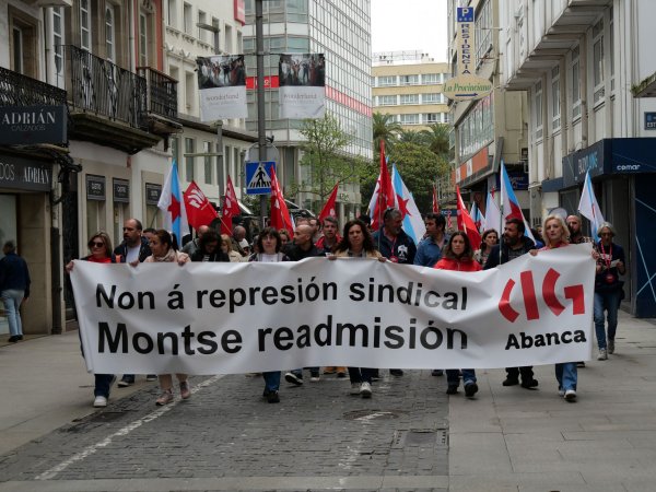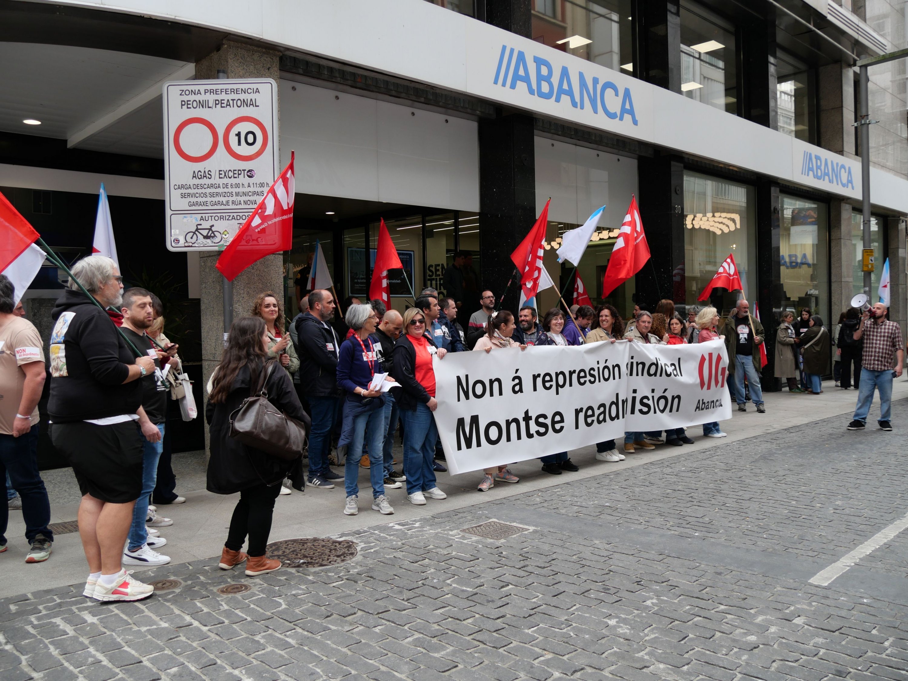 A xeira de mobilizacións concluíu diante da OP de Abanca para denunciar, unha vez máis, a represión sindical e reclamar a readmisión da compañeira Montse, delegada da CIG no comité provincial de Pontevedra, que foi vítima dun despedimento represivo por parte da empresa en xullo de 2025. O xuízo polo despedimento foi adiado até o mes de setembro.